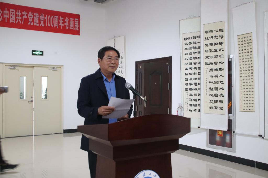 建筑工程学院团总支书记在主持中介绍,此次书画展共征集展出作品249幅,涵盖书法作品、国画作品、油画作品、水彩作品。这些作品主题鲜明,内涵丰富,题材丰富,异彩纷呈。本次画展旨在以艺术展览的方式,追寻中国共产党的百年岁月,为庆祝中国共产党成立100周年献上最美的祝福。张仁杰副校长对本次画展做了致辞,他指出烟台理工学院要以开展庆祝建党100周年书画展为契机,增强广大党员的使命感、责任感,教育引导青年党员知党史、感党恩、跟党走。他希望全校师生不忘初心、牢记使命,以优异的成绩向建党100周年献礼。最后他祝愿烟台理工学院“奋进新时代,共绘同心圆”活动圆满成功!